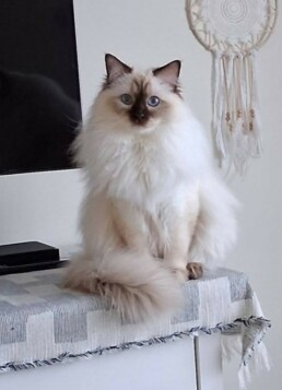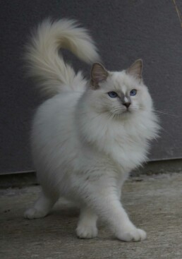 La fourrure soyeuse mi-longue est d’une douceur incomparable. Leur robe est plus ou moins courte, mais je m’attache à réaliser mes mariages afin de garder cette caractéristique que beaucoup aiment : l’entretien facile, une robe qui ne fait pas de nœud. Néanmoins, en période de mue, il vous faudra brosser plus d’un brossage hebdomadaire. En effet, en hiver, vous aurez un chat au pelage soyeux, beaucoup plus épais et long, et vous pourrez aussi admirer sa majestueuse collerette. Il porte sa queue en panache, fièrement. Leurs pattes, avec leurs longs poils inter-digitaux, sont une caresse sous vos doigts et feront de lui un glisseur maladroit.