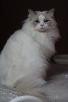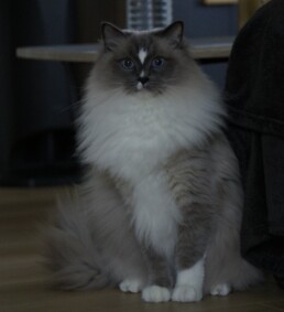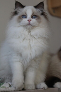 Ses yeux bleus vous attirent, vous vous dirigerez alors vers le Ragdoll point, qui est le plus connu de la race. Il existe aussi les Ragdolls mink, sépia, et solid, avec une répartition de la couleur de plus en plus foncée. Ce sont eux aussi de vraies beautés, avec des yeux qui vont des tons aigue-marines, verts ou or. Malheureusement, la taille de mon élevage que j’ai voulu « familial », ne me permet pas d’élever tous les Ragdolls dans toutes les couleurs, les répartitions de la couleur, et les patrons.